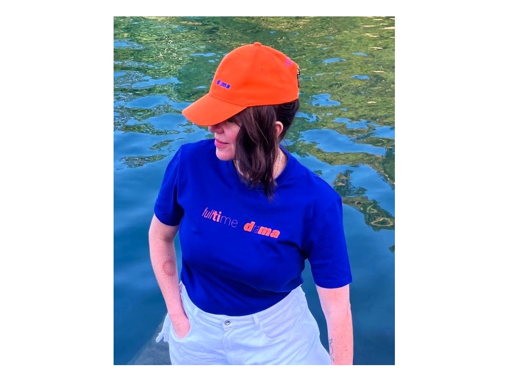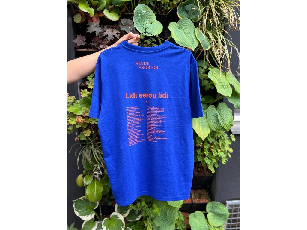 Elektricky modré tričko z organické bavlny, vepředu s nápisem „fulltime drama” a s básní „Lidi se*ou lidi” básníka Karla Škrabala na zádech. Dopřej kolemjdoucím kvalitní čtení.